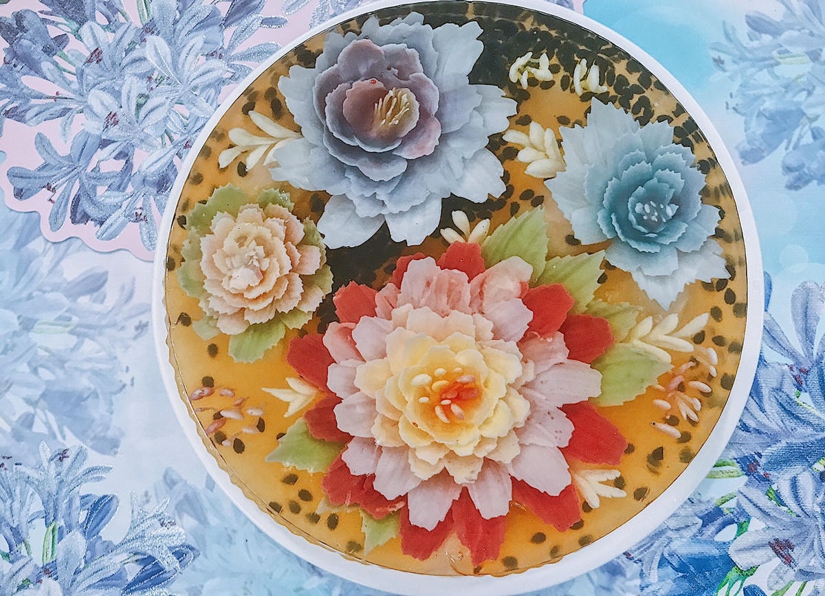 -Green Arts Bakery- 認識我的人都知道我喜歡做甜點 大家知道什麼是「果凍花」嗎?! 「果凍花」是在果凍內鑲入利用天然蔬果汁調配而成的顏色 製作栩栩如生的花朵,晶瑩剔透的3D立體果凍花造型 果…